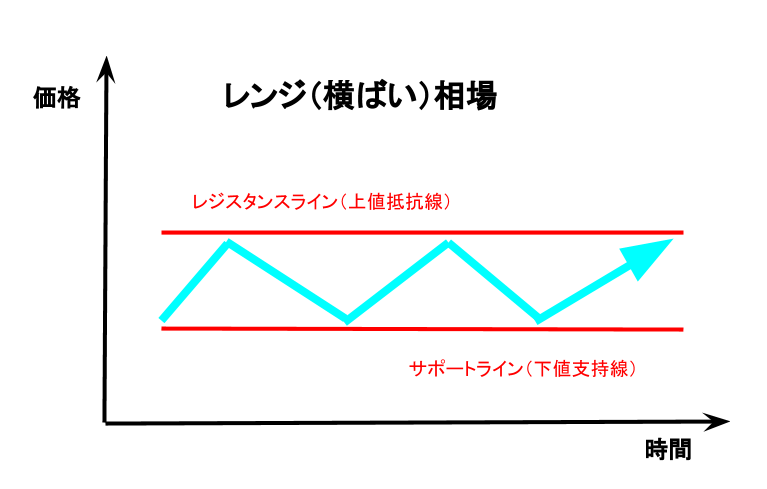 レンジ相場は、"横ばい"や"揉み合い"とも呼ばれます。